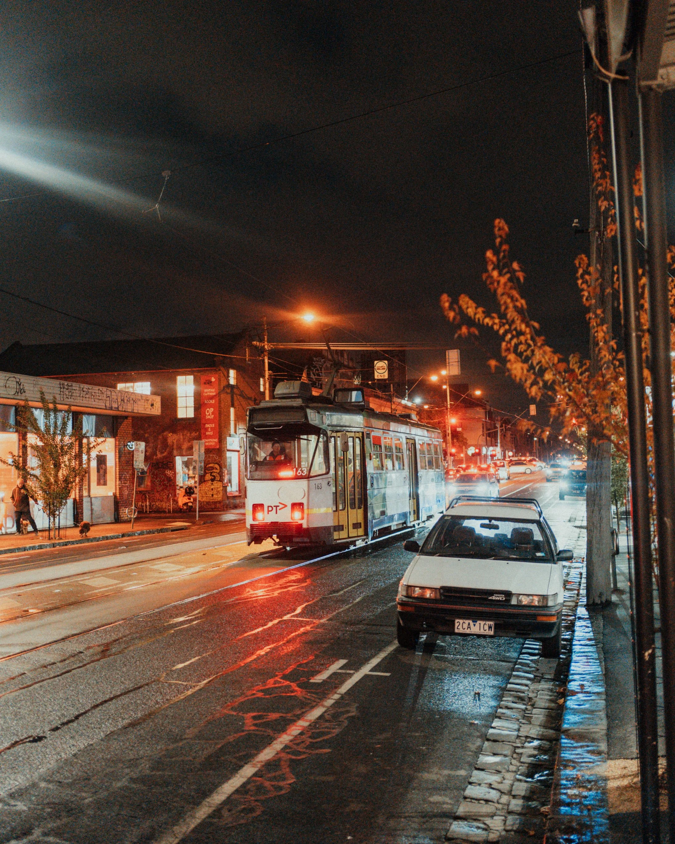 Nighttime city street scene with vintage tram and parked cars along wet pavement. Streetlights and building windows illuminate the scene.