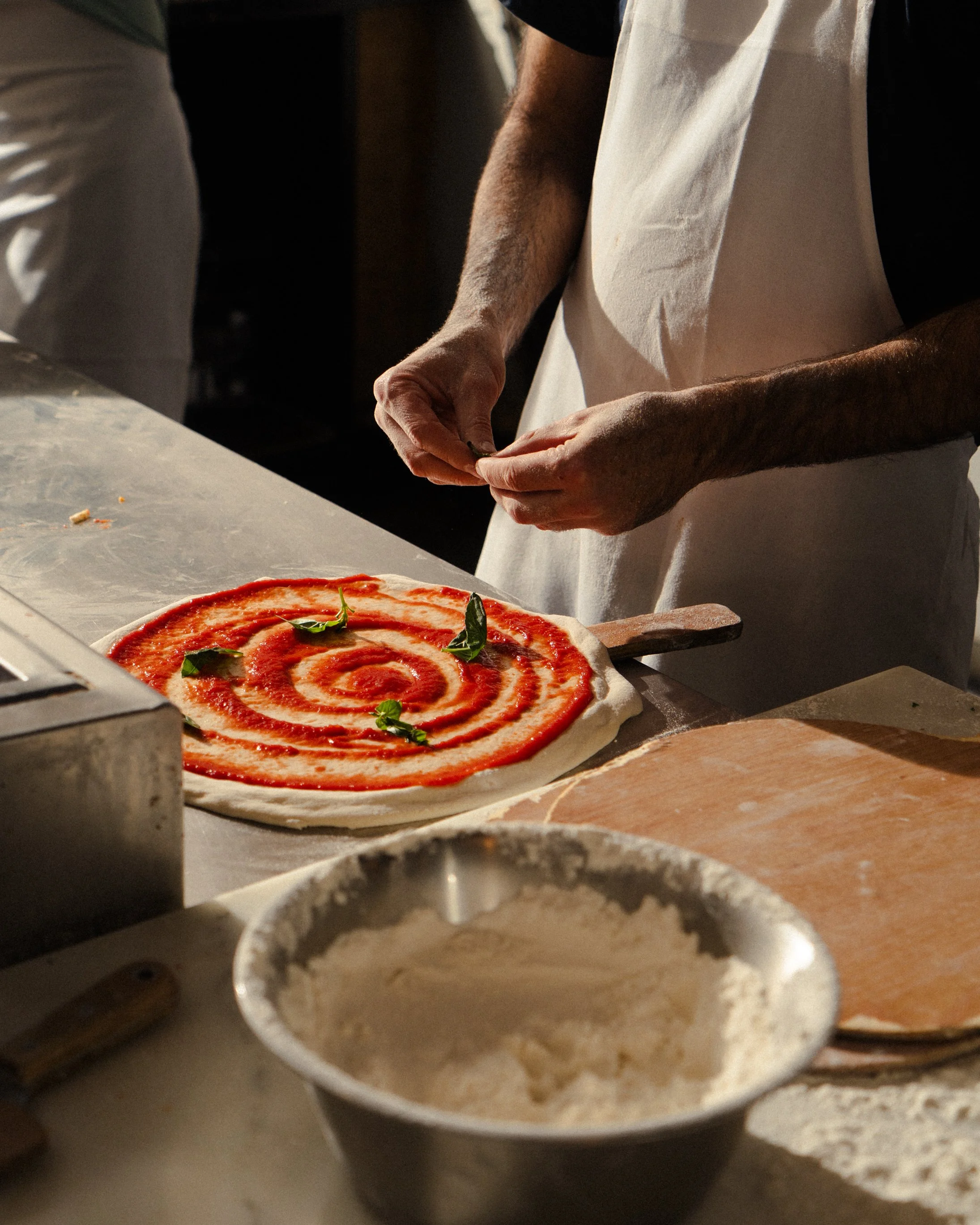 A person preparing a pizza with tomato sauce and basil leaves, rolling dough on a counter.