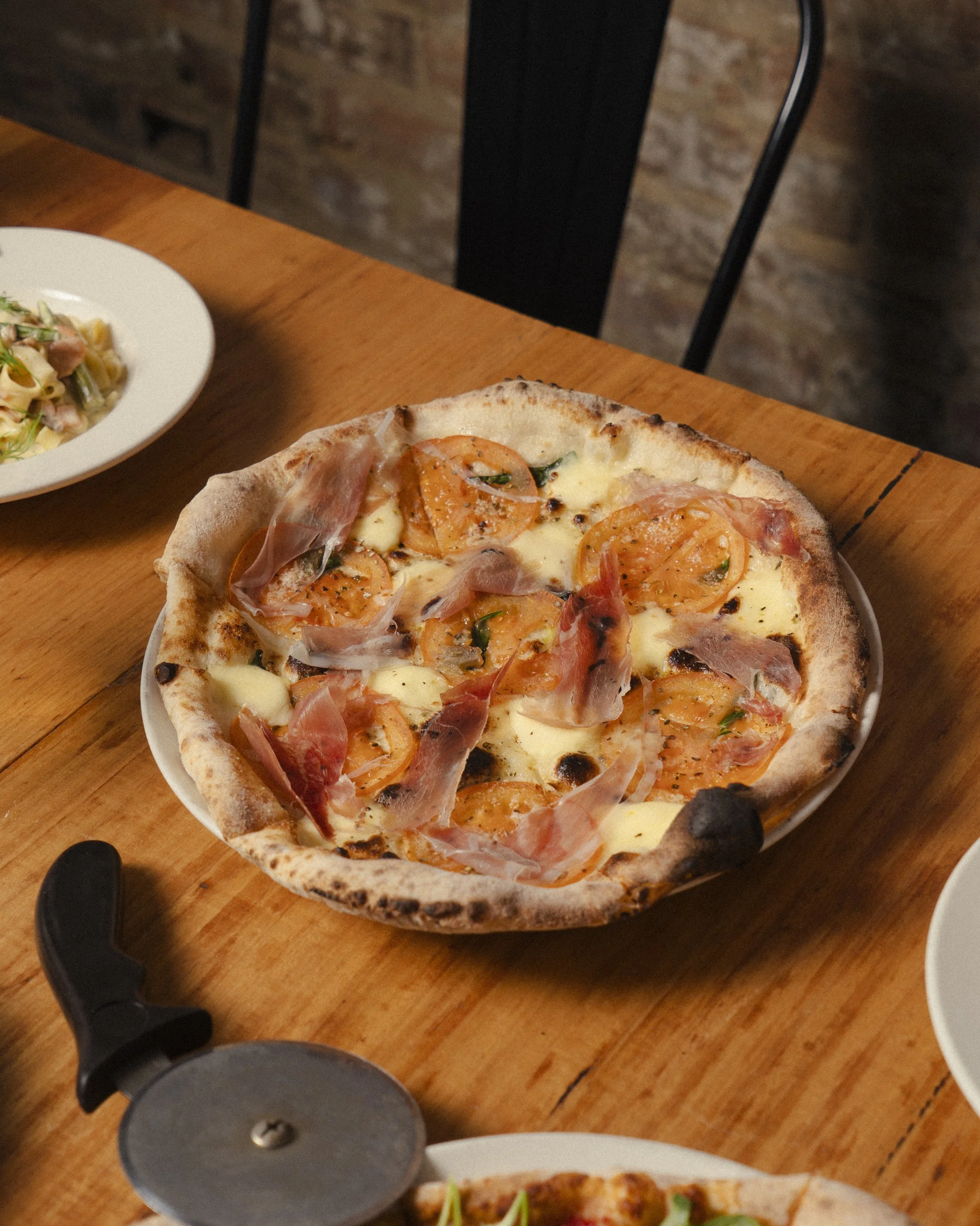 Pizza topped with tomato slices, prosciutto, and melted cheese on a wooden table.
