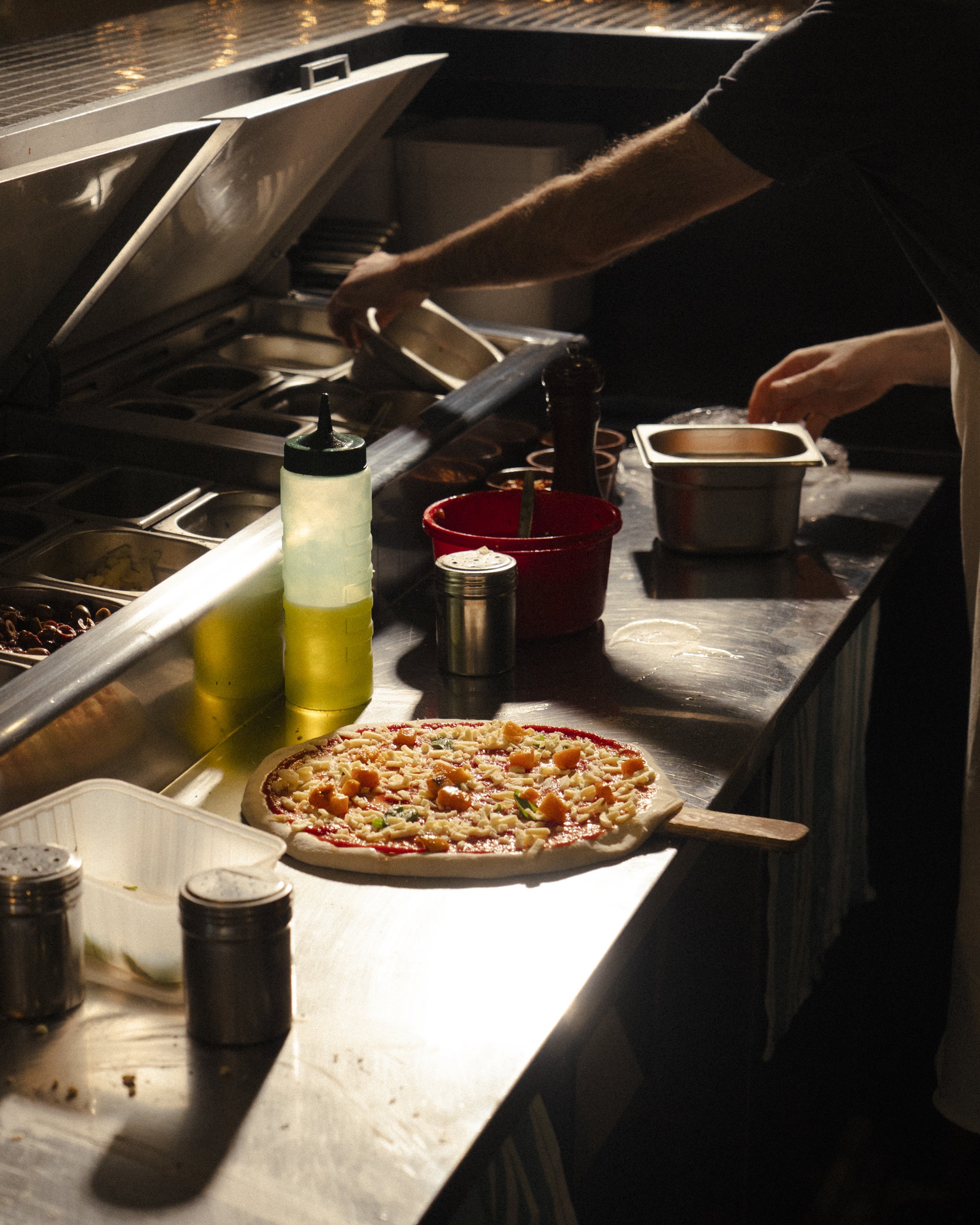 A person preparing a pizza in a commercial kitchen with various ingredients and tools on the stainless steel counter.