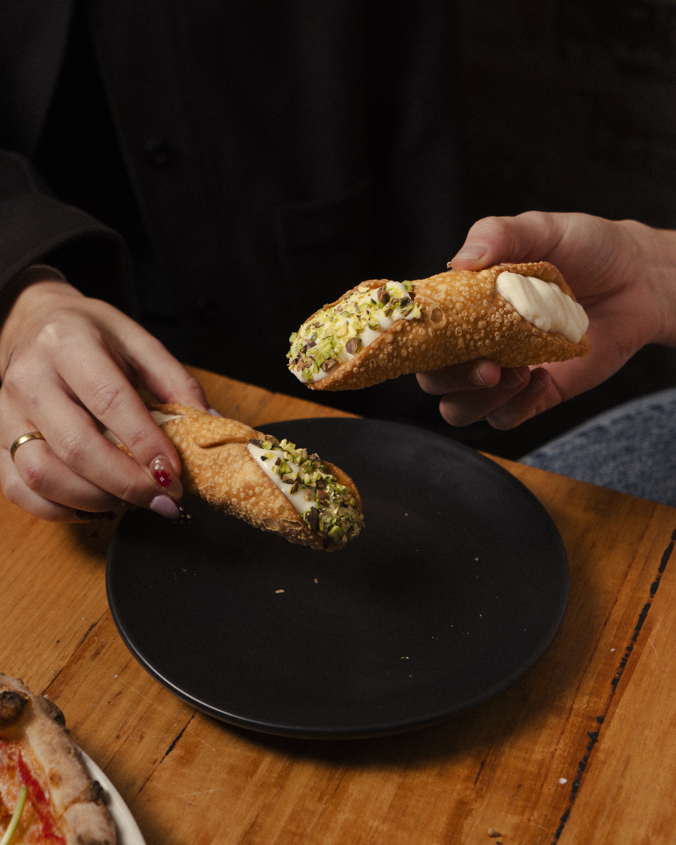 Person holding pistachio and cream-filled cannoli with toppings, sitting at a wooden table with a black plate and pizza in the corner.