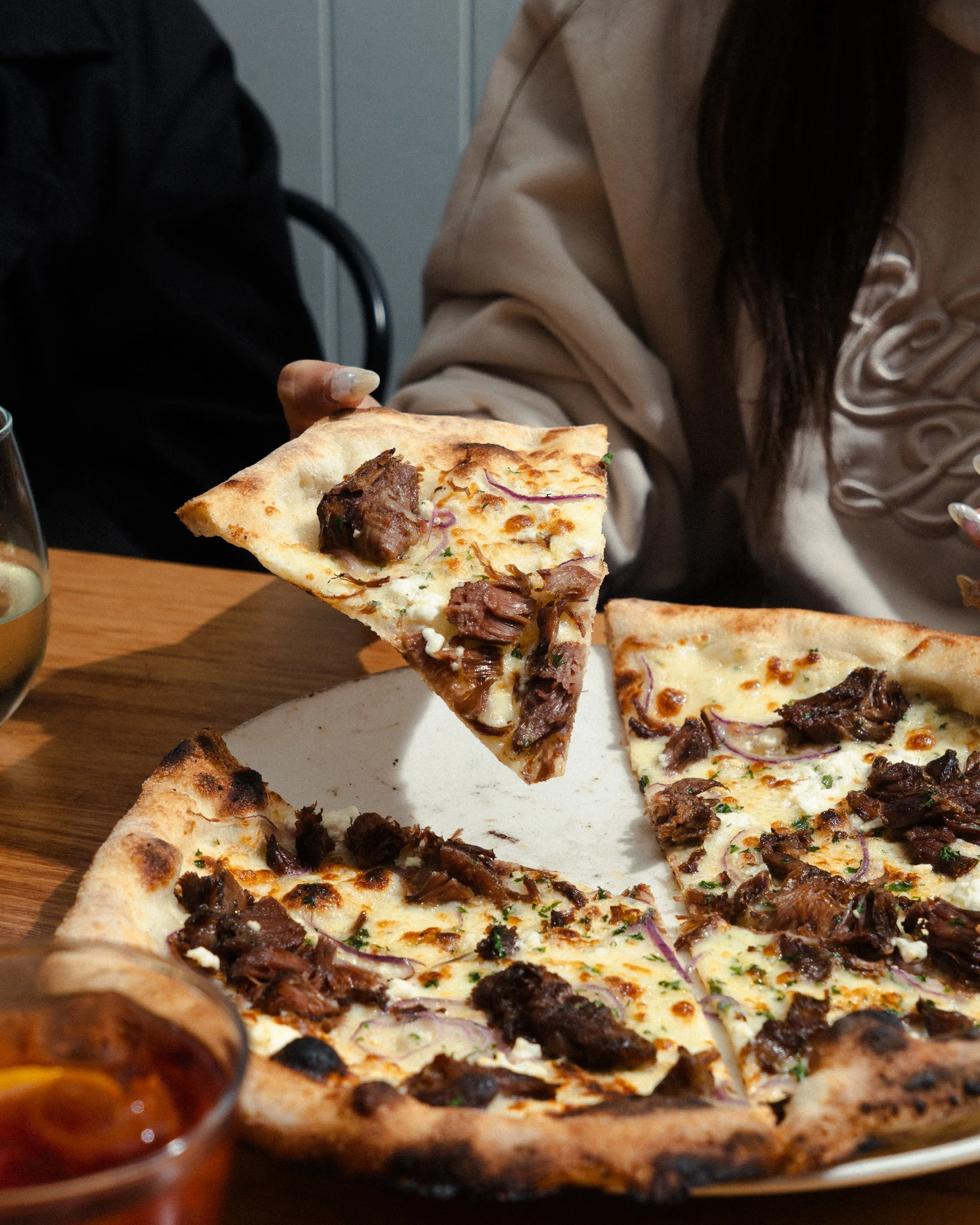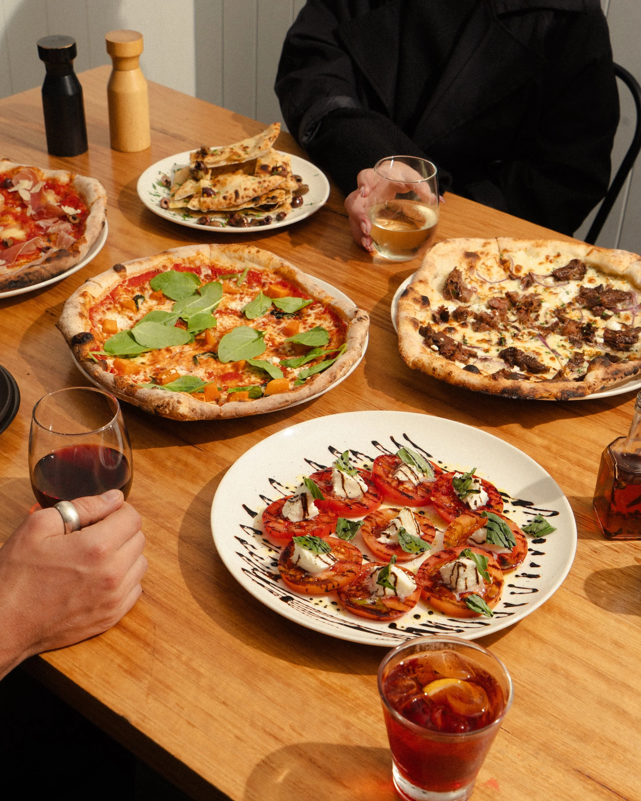A wooden table with three pizzas, a plate of quesadillas, a glass of red wine, a glass of white wine, and a cocktail. Two people are seated at the table, one holding a glass of white wine.