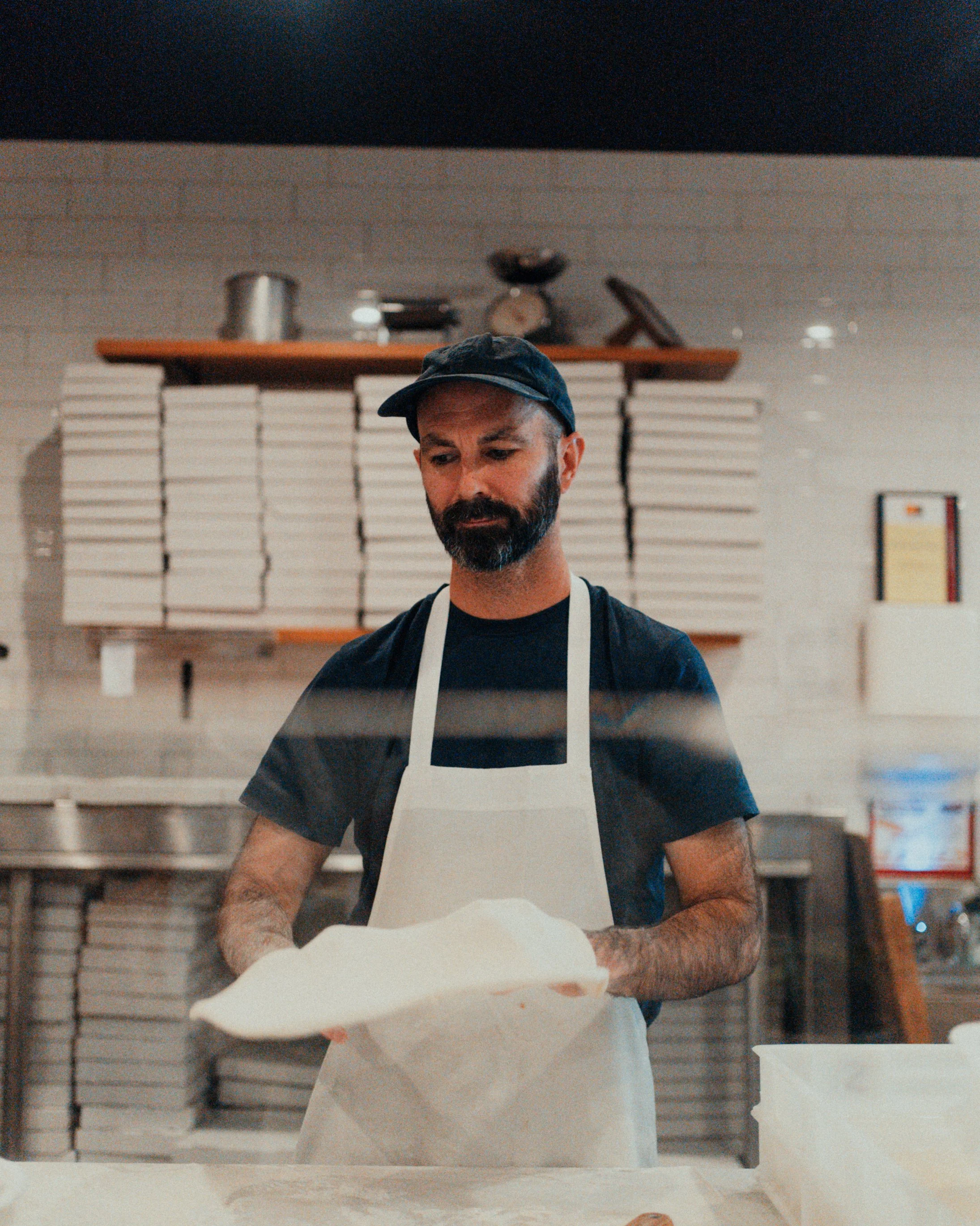 A man with a beard wearing a black cap, black t-shirt, and white apron, looking down at dough in a bakery or pizzeria.