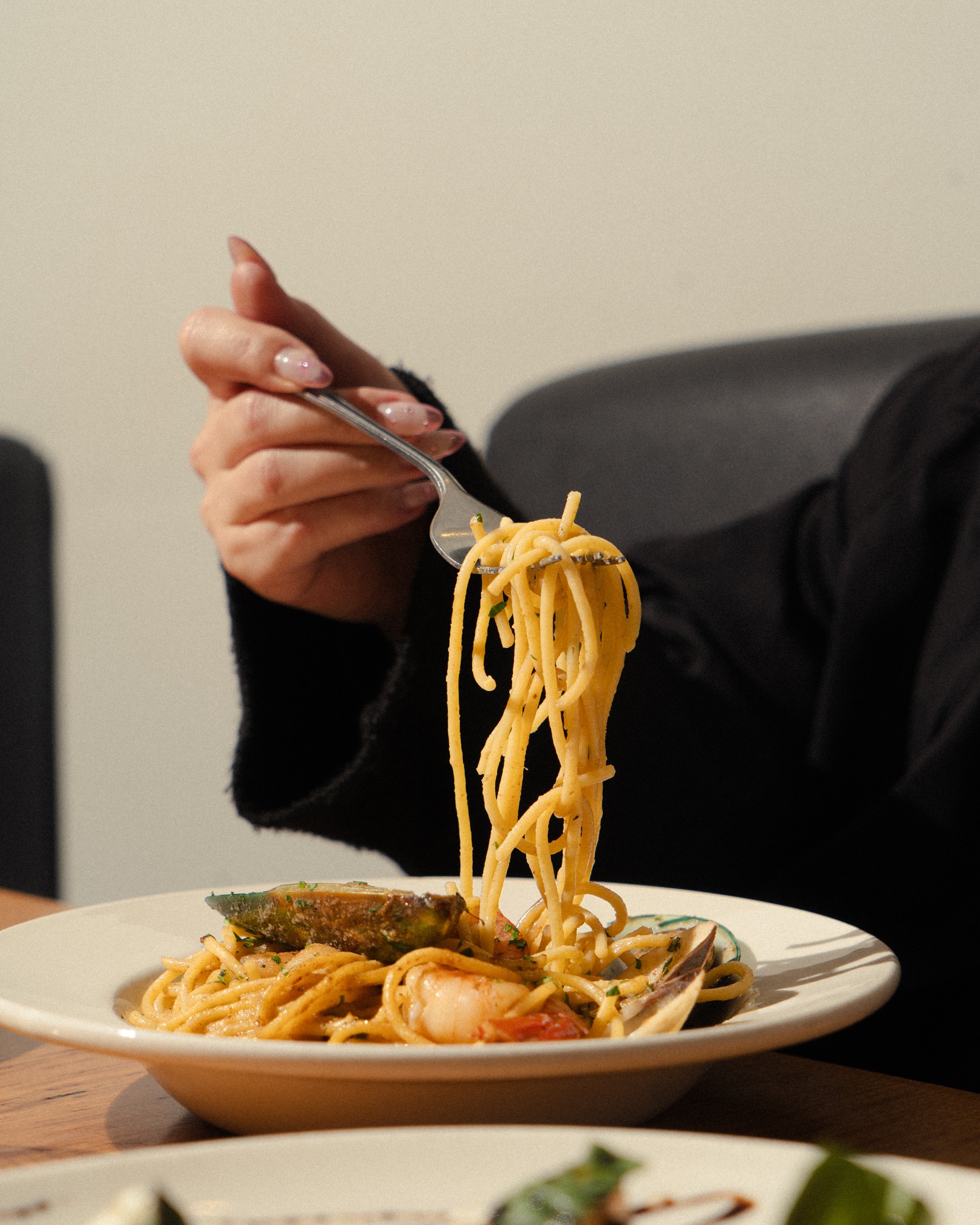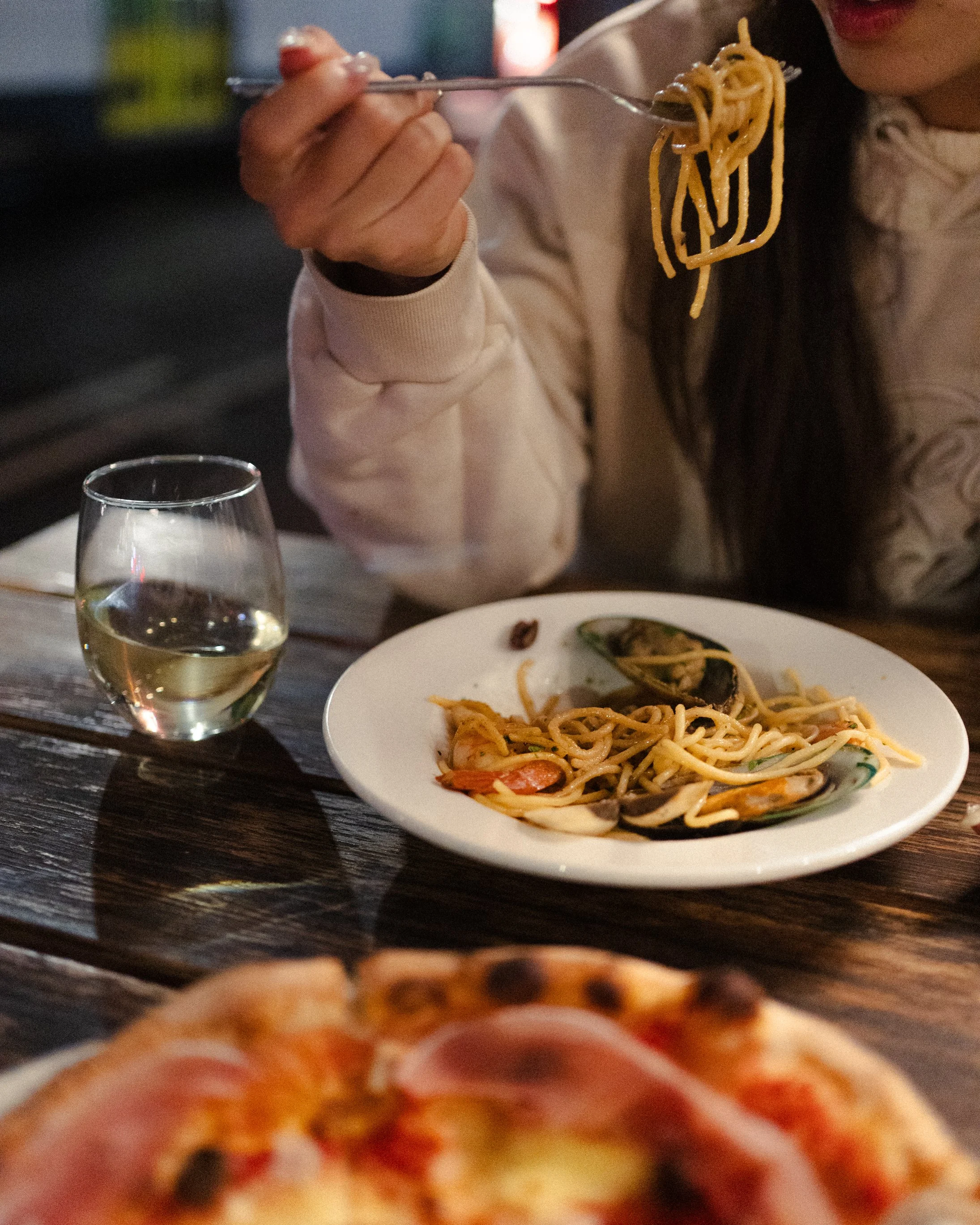 A person eating spaghetti with seafood, and a plate of pizza in the foreground.