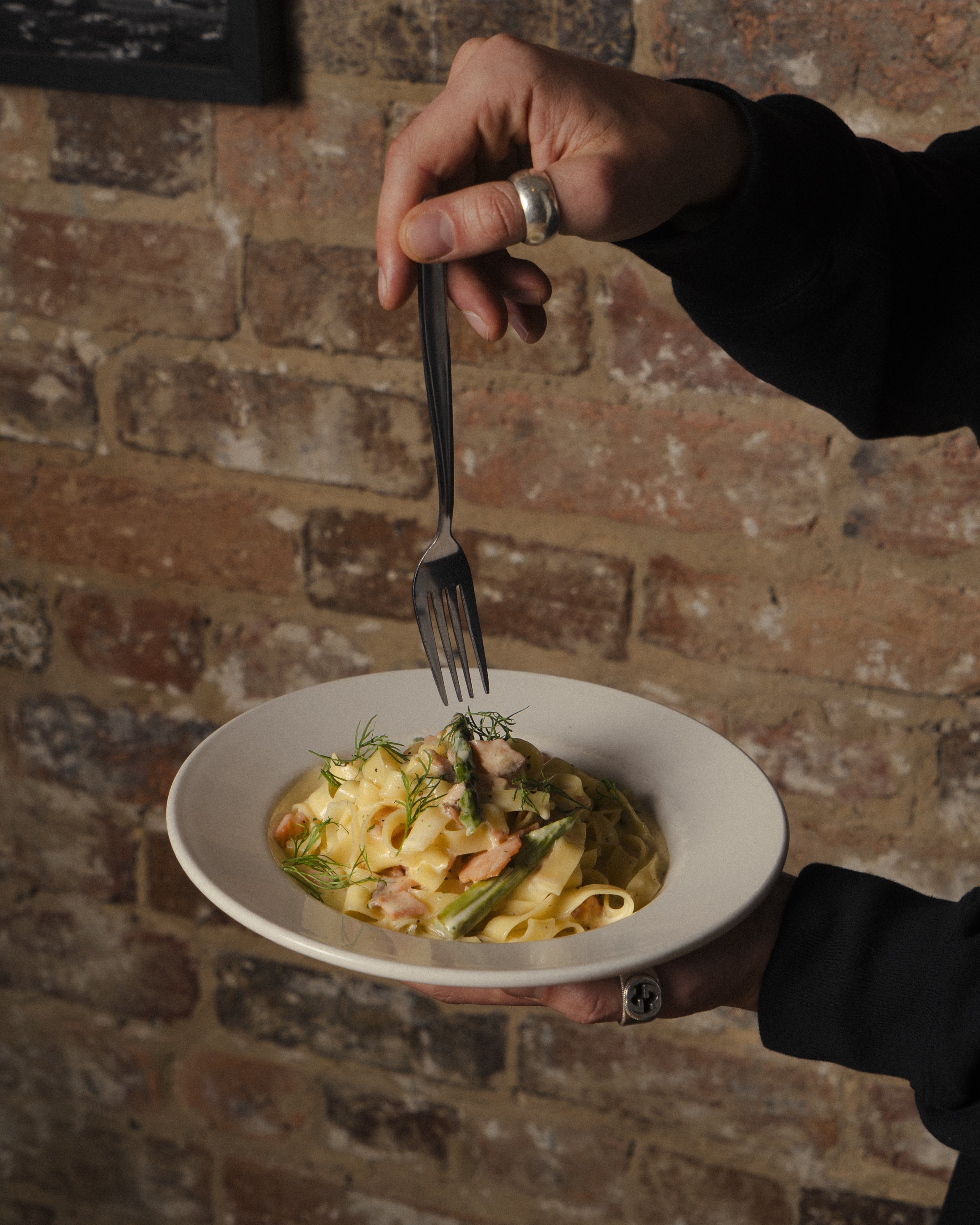 Person holding a fork over a plate of pasta with cream sauce, green beans, salmon, and herbs against a brick wall background.