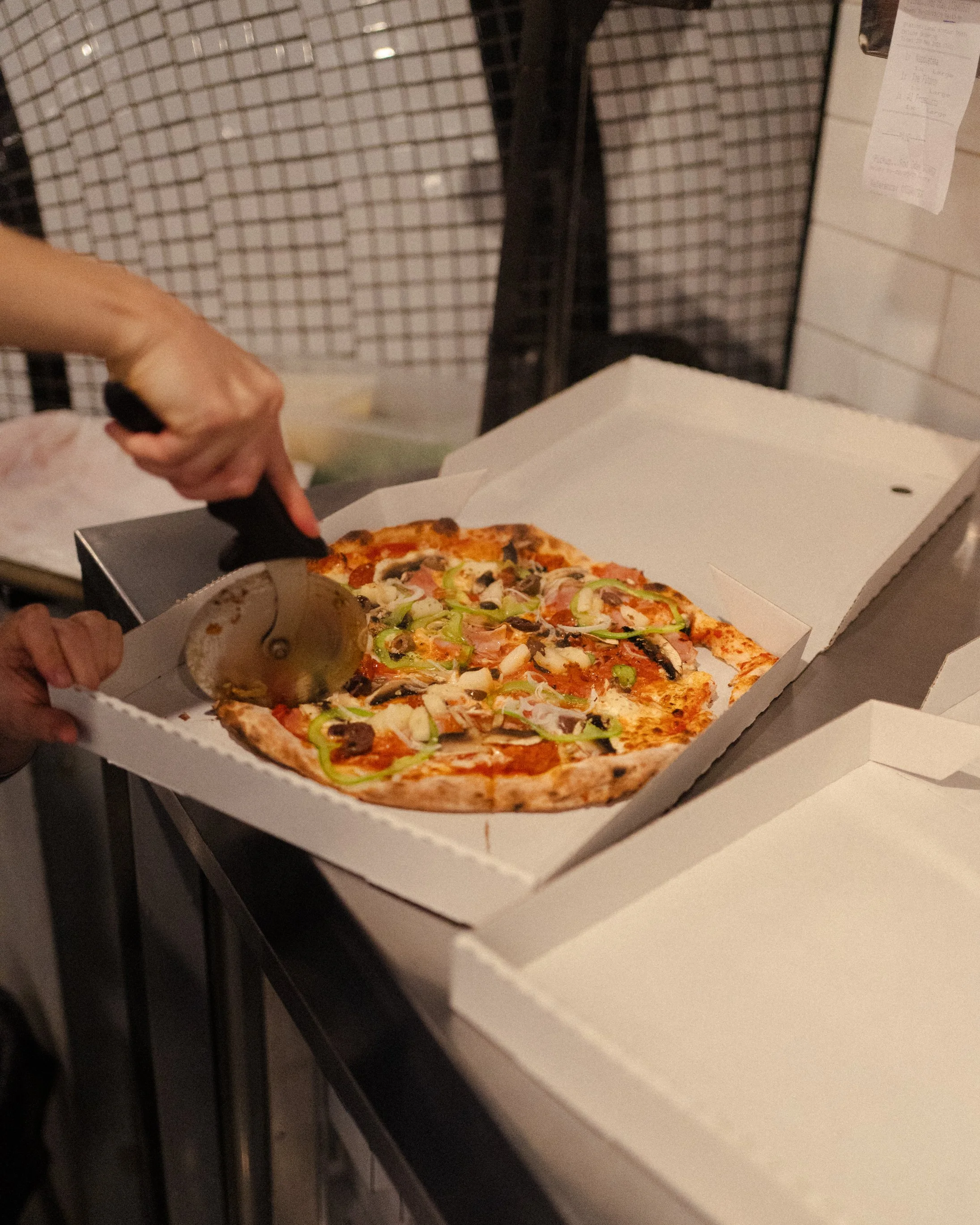 Person using a pizza cutter to slice a pizza with green peppers, mushrooms, and other toppings in an open pizza box.