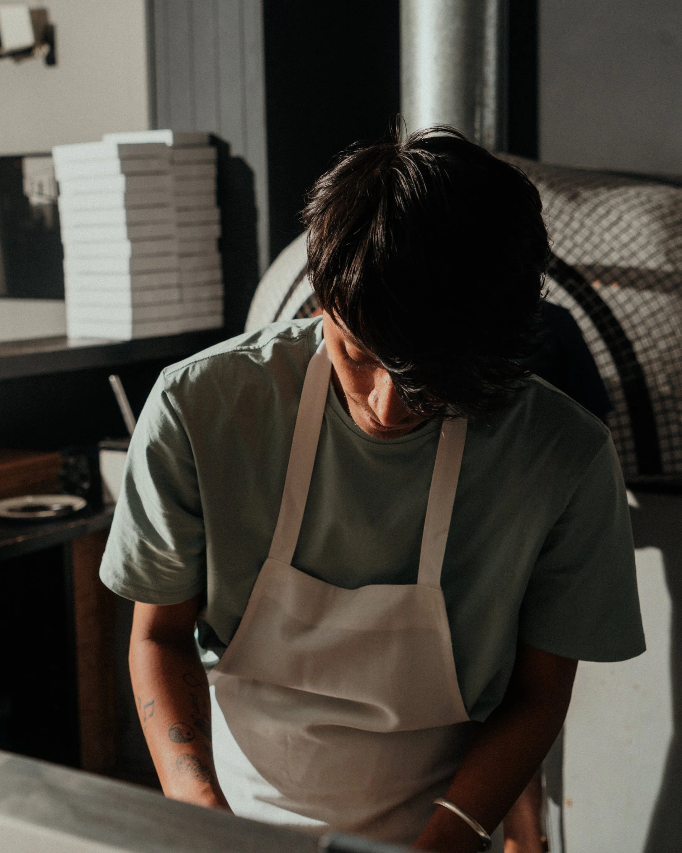 A person wearing a beige apron bends over a work surface in a dimly lit room, possibly a kitchen or bakery, with a stack of white boxes on a shelf behind them.