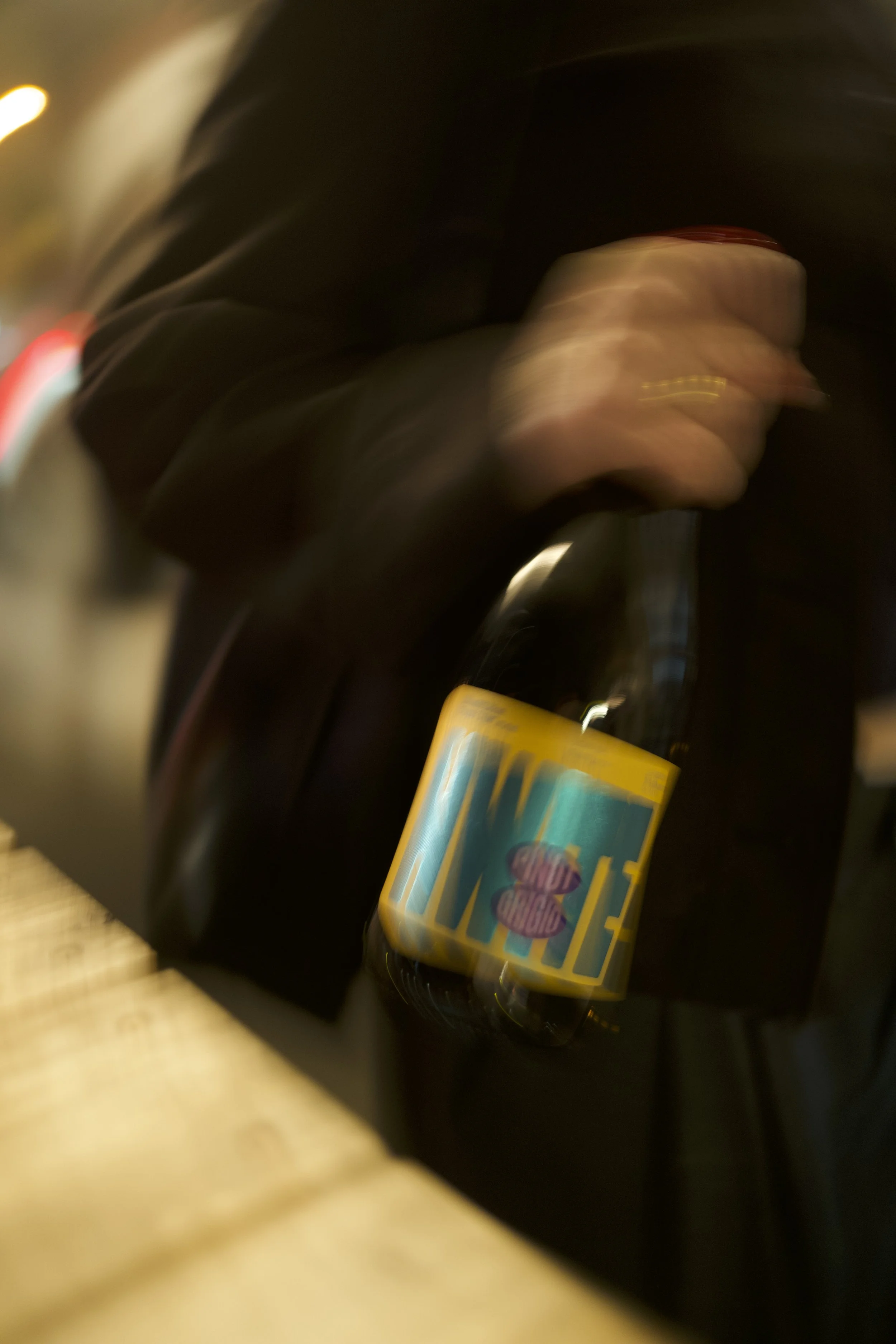 A person holding a bottle of Corona beer with a colorful label in a dimly lit setting.