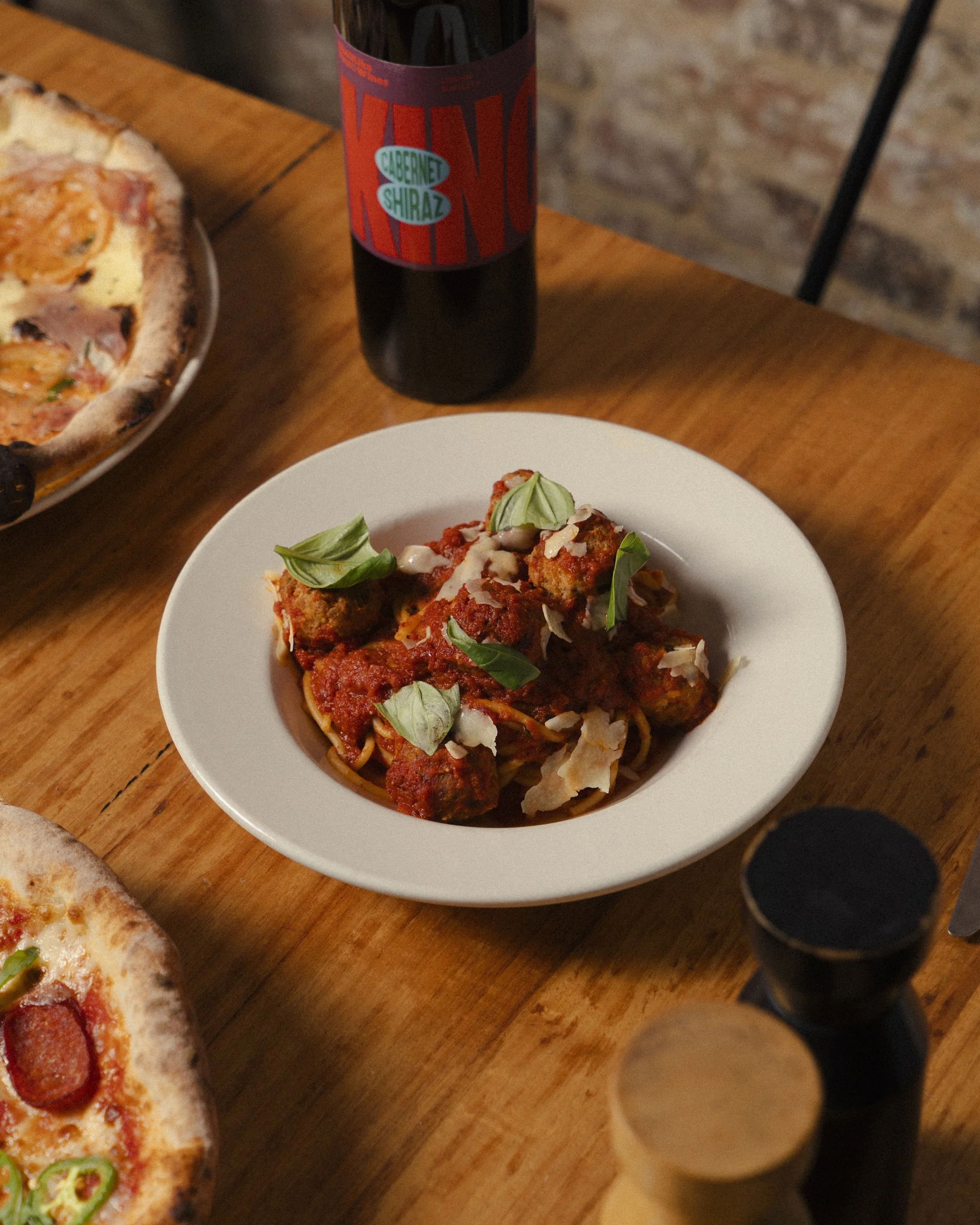 Plate of spaghetti with meatballs, topped with basil and cheese, on a wooden table