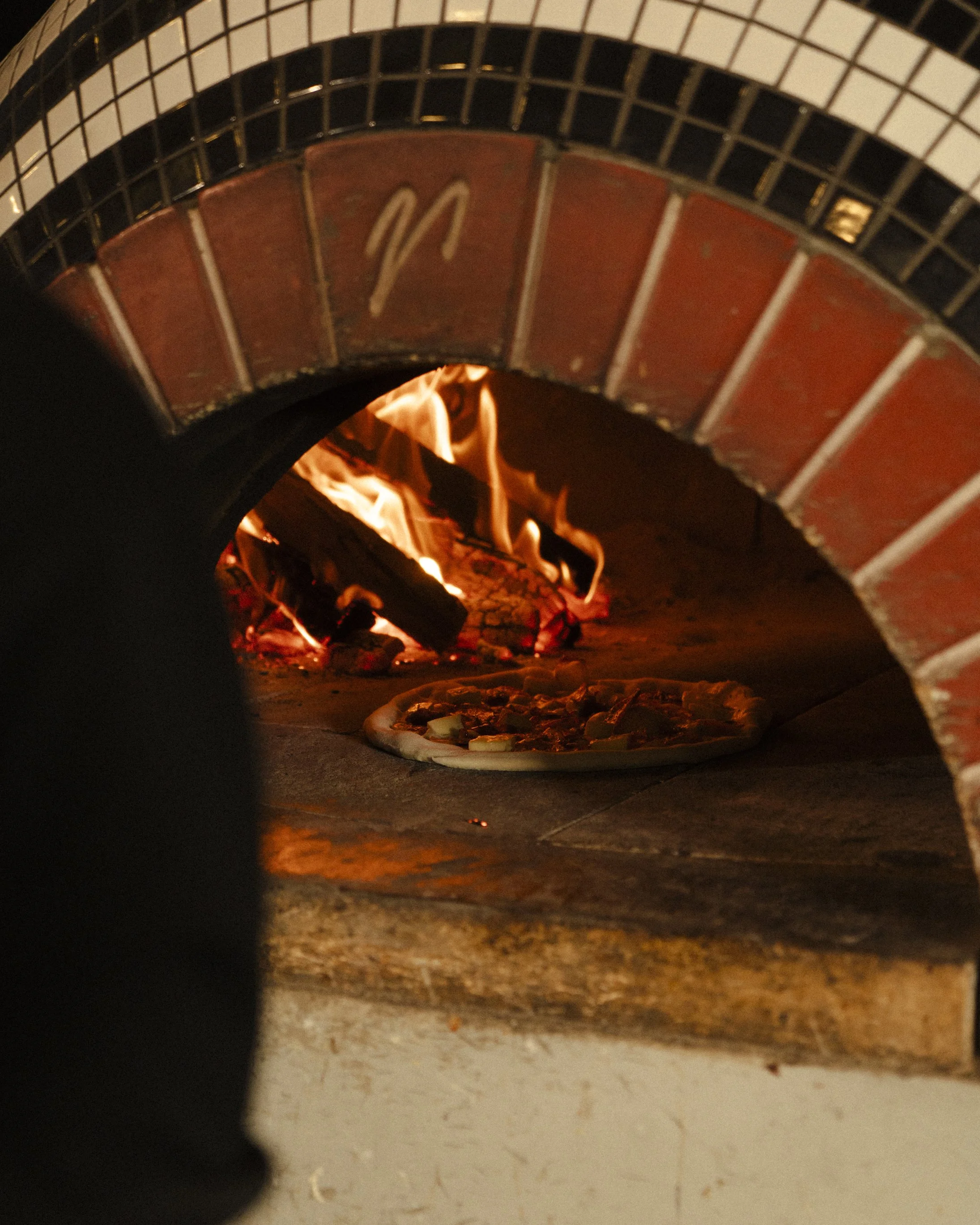 Pizza baking in a wood-fired oven with flames and firewood inside.