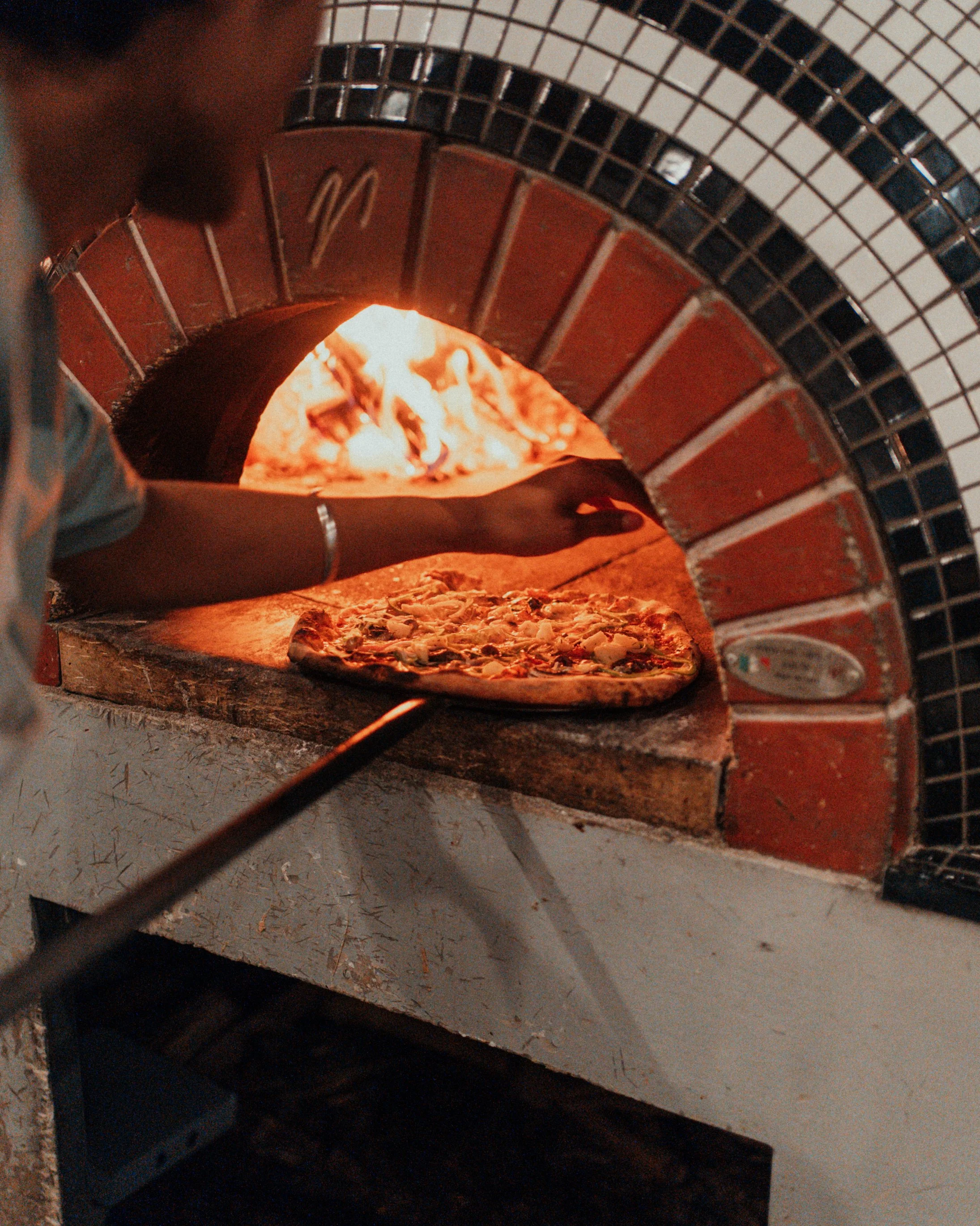 Person removing a freshly baked pizza from a wood-fired brick oven.