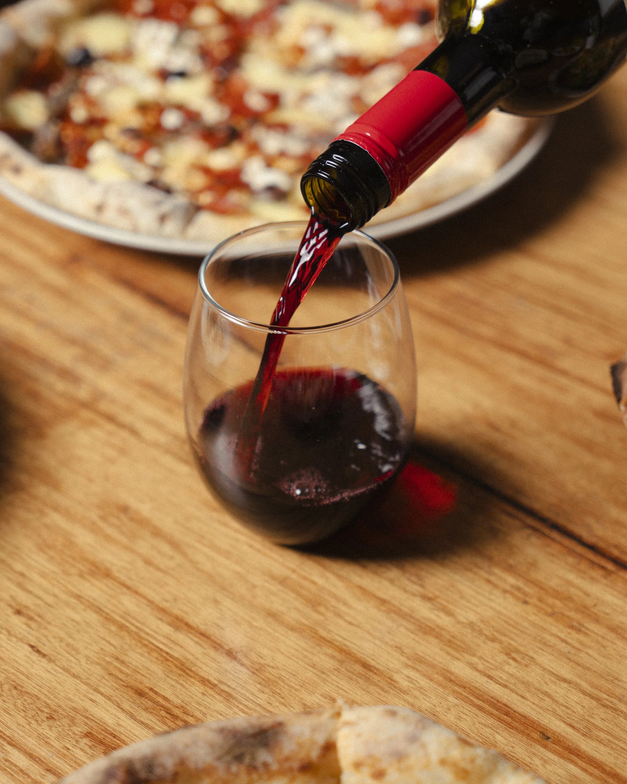 Red wine being poured into a glass with pizza in the background on a wooden table.
