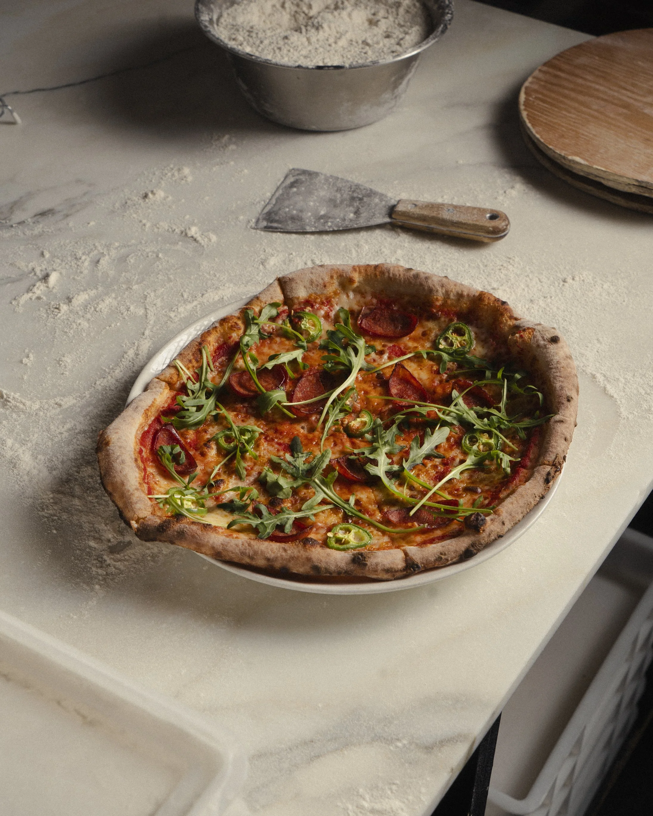 Fresh homemade pizza with pepperoni, sliced green peppers, and arugula on top, on a white plate. The pizza is on a counter with flour, a pizza cutter, a bowl of flour, and a wooden pizza peel.