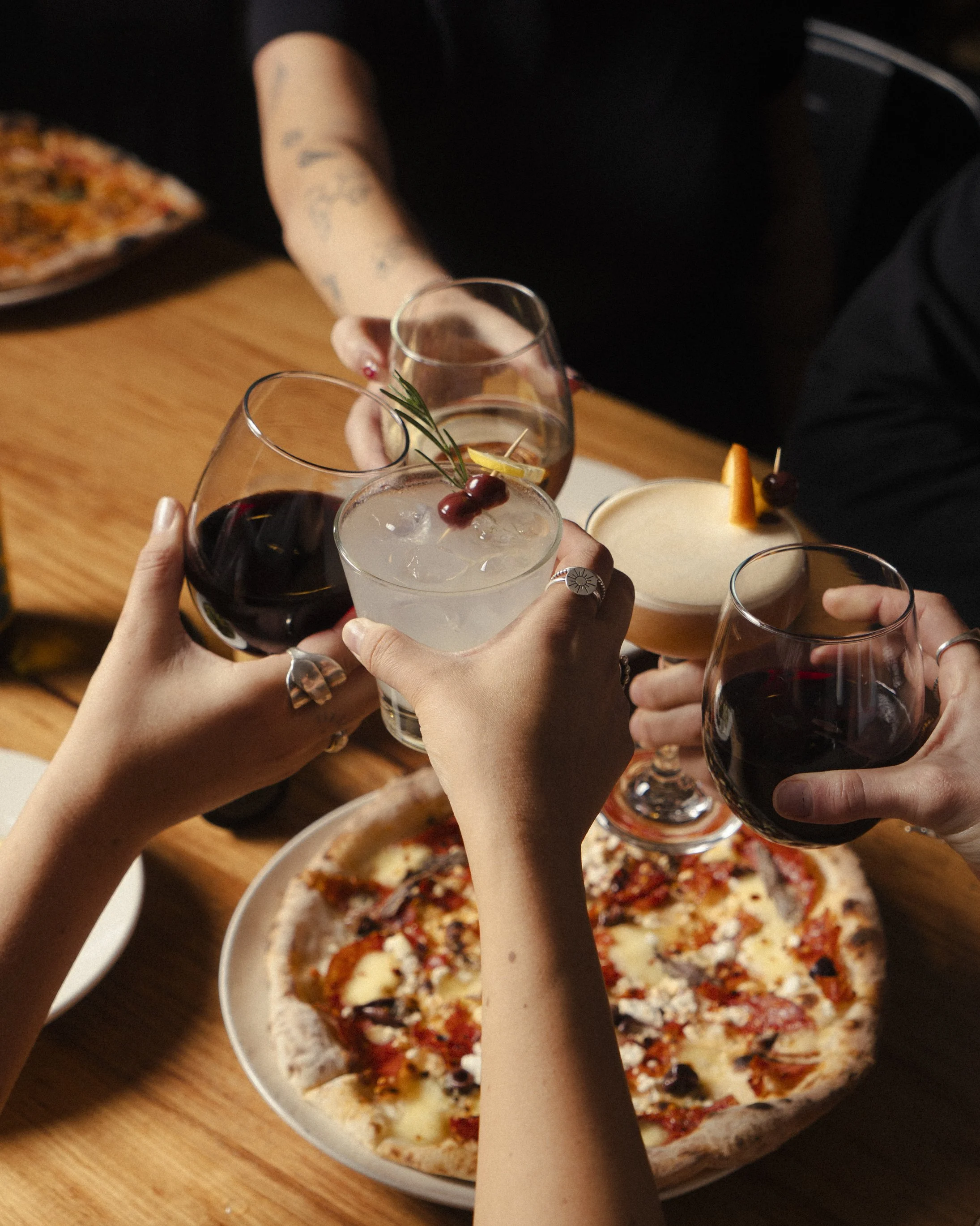People toasting with various cocktails and wine glasses at a table with pizza, in a social gathering setting.